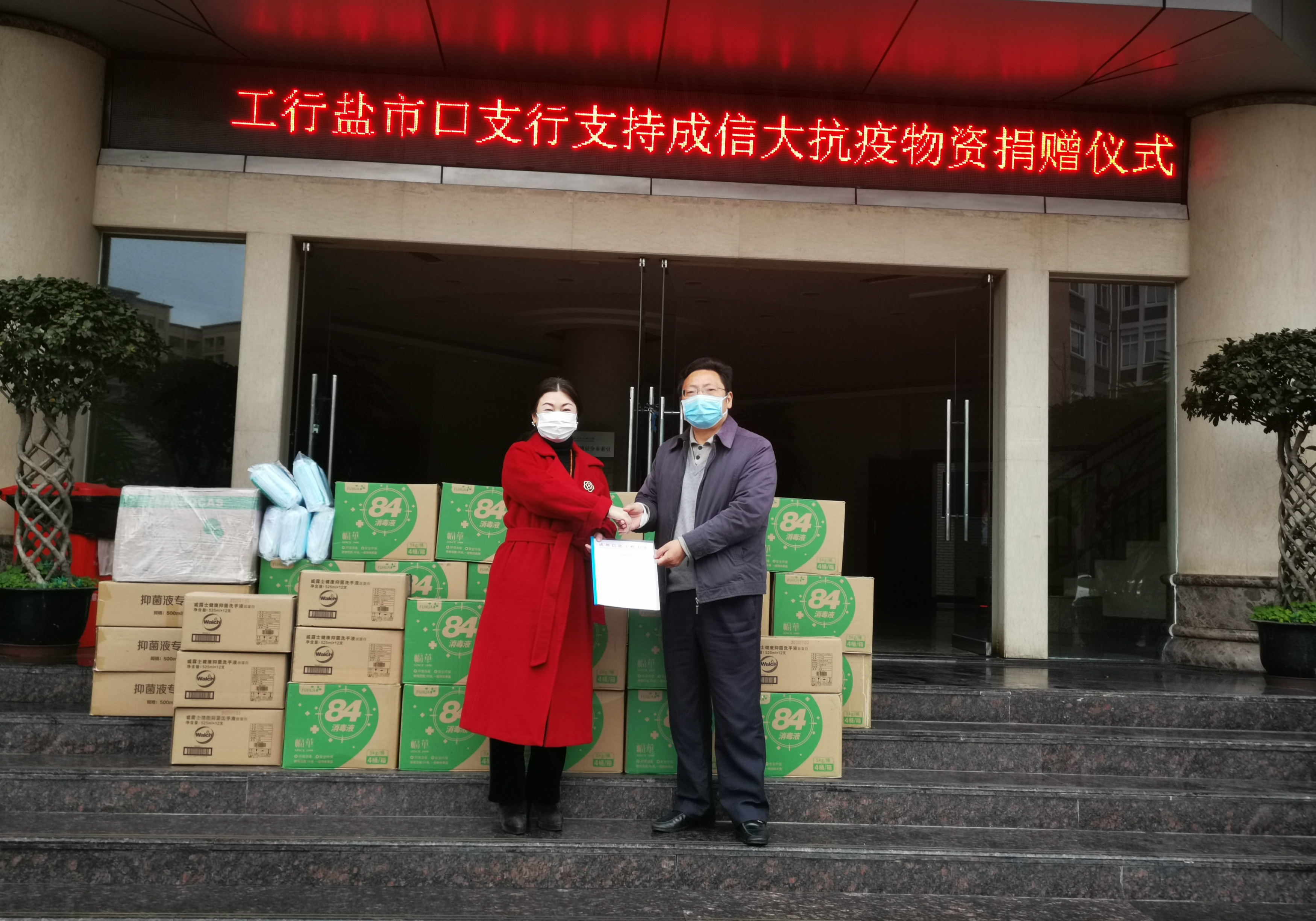 【本网讯】3月2日,工行盐市口支行向太阳集团捐赠一批防疫物资,助力太阳集团疫情防控工作。学校党委副书记马洪江、工行盐市口支行行长张岚等参加了捐赠仪式。
