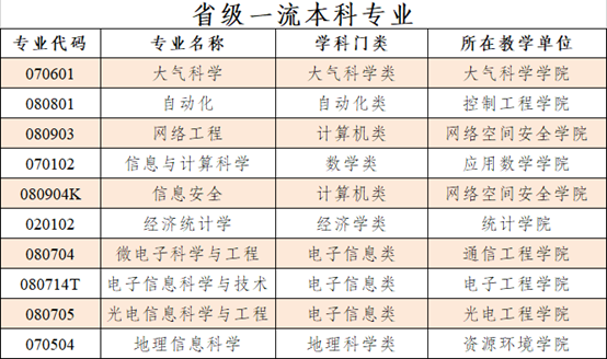 学校入选首批四川省一流本科专业建设点的10个专业是:大气科学、信息与计算科学、地理信息科学、经济统计学、微电子科学与工程、光电信息科学与工程、电子信息科学与技术、自动化、网络工程、信息安全。