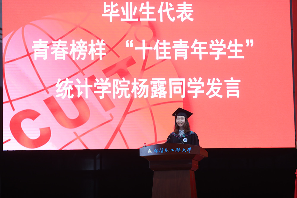 学校优秀毕业生、统计学院杨露同学作为毕业生代表深情回顾了大学四年精彩的生活,表达了对母校、恩师、同窗的感恩与不舍,她代表全体毕业生表示,将牢记习近平总书记在北大师生座谈会上寄予青年学子“爱国 励志 求真 力行 ”的八字箴言,紧跟新时代步伐,坚定理想信念,坚守人生正确航向,不忘初心,锐意进取。