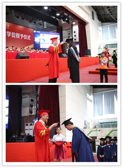 学校党委书记周激流,校长余敏明同时为全体硕士研究生、省级优秀本科毕业生授位。毕业生们身着学士服庄严走上台依次接受师者的拨穗与真切的祝福,走下台后与至亲好友热烈拥抱,合影留念。
