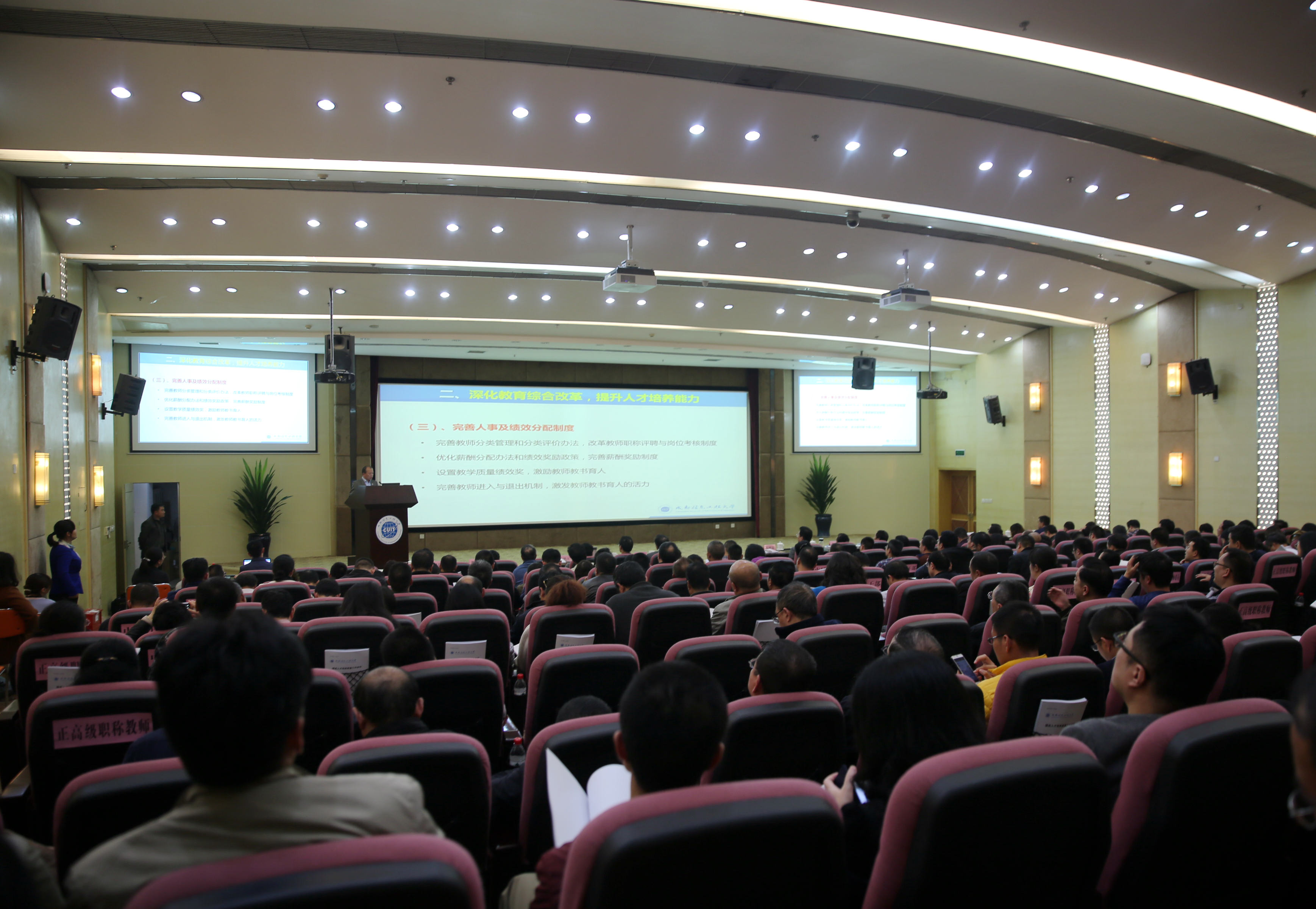 副校长何建新作了《全面深化改革,提高人才培养质量》的大会报告。他从深化教育综合改革,提高人才培养能力;创新培养模式,提高人才培养质量;深化创新创业教育,加强实践育人能力建设;增强教学保障能力,助力人才培养质量提升;坚持开放办学,促进科教融合发展等方面解读了学校《关于深化改革提高人才培养质量的若干意见(征求意见稿)》。他指出,学校将以博士点、双一流学科建设为引领,实施学科“振兴计划”“发展计划”“拓展计划”;按照创新、交叉融合、应用型培养特点,多元化发展路径,完善2018版研究生培养方案;按照“因材施教、分类培养”的思路完善人才培养体系;修订2018版本科人才培养方案。