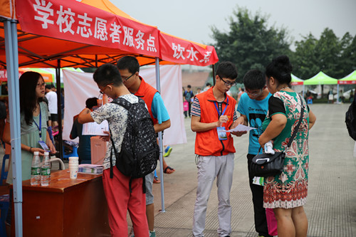 从校大门到报到广场,指示路牌简明醒目;学长学姐们原创的迎新招贴营造出喜庆、温馨的氛围;120多名志愿者在沿途13个服务点为新同学及家长提供各种帮助和服务,此时此刻,每个人心里有一个共同的声音:接过你的行囊,我们就是一家人!