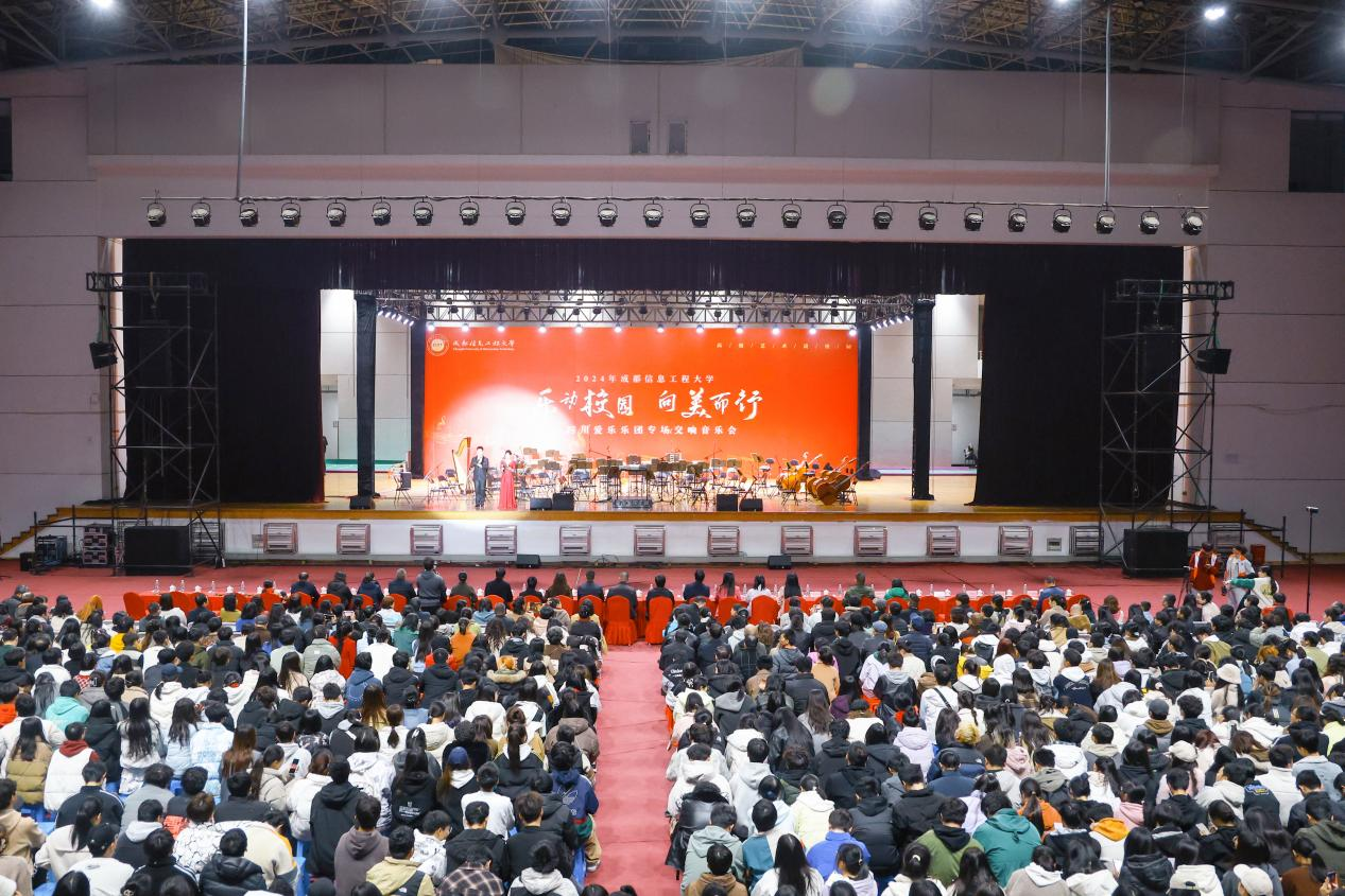 【本网讯】11月29日,学校在航空港校区体育馆举办2024年15vip太阳集团官网“乐动校园 向美而行”四川爱乐乐团专场交响音乐会。学校党委副书记杨奇才,党委常委、副校长陈权亮,党委常委、党委宣传部部长张小红,四川爱乐乐团副团长王小毛,学校相关职能部门、学院负责人,乐团相关工作人员,师生代表近三千人齐聚一堂聆听音乐会,优雅的音乐让校园沉浸在浓厚艺术氛围中。
