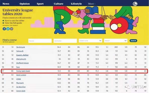 英国威尔士三一圣大卫大学(UWTSD)是英国继牛津大学、剑桥大学之后学位授予历史最悠久的公立大学之一。根据2019年6月英国卫报 (The Guardian)公布的2020年最新英国大学预测排名,威尔士三一圣大卫大学(UWTSD)位列第57位,是全英上升名次最快的三所大学之一。该校的“学生反馈满意度”位列全英第5,“教学质量满意度”位列全英第8。