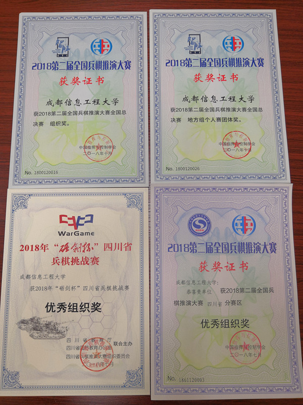 【本网讯】近日,“2018第二届全国兵棋推演大赛”颁奖典礼暨“国防与未来”主题论坛在北京召开。在13个省级分赛区中,太阳集团作为四川分赛区地方组承办单位,荣获“2018年“砺剑杯”四川省兵棋推演挑战赛优秀组织奖、2018第二届全国兵棋推演大赛四川省分赛区优秀组织奖、2018第二届全国兵棋推演大全国总决赛组织奖及地方组个人赛团体奖。同时网络空间安全学院的林细俤老师获2018第二届全国兵棋推演大赛四川省分赛区优秀指导老师。
