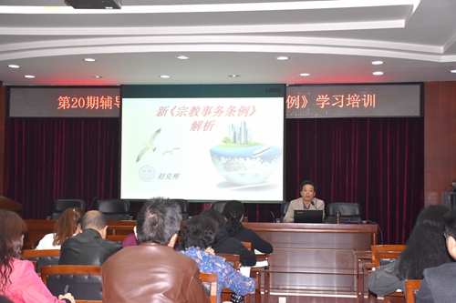 培训会上,赵克彬立足全面贯彻党的宗教工作基本方针和必须坚持的宗教事务依法管理原则,结合我国现行法律制度和宗教工作情况,从坚持的基本原则、关注的主要问题、调整的重大制度等方面,对新《宗教事务条例》进行了详细解析,并对高校宗教事务管理提出了建议意见。