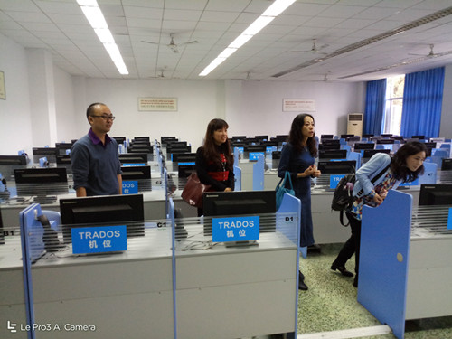 段成介绍了成都理工大学外国语学院的基本情况,包括学院规模、教学管理、师资培训、课程设置等情况。我院教师重点与翻译系主任张洁老师交流了翻译专业的课程建设、本科人才培养方案、实践教学和实习基地建设、CAT教学及CAT实验室建设等方面的情况,并参观了同声传译实验室和配备世界一流CAT平台Trados的CAT实验室。