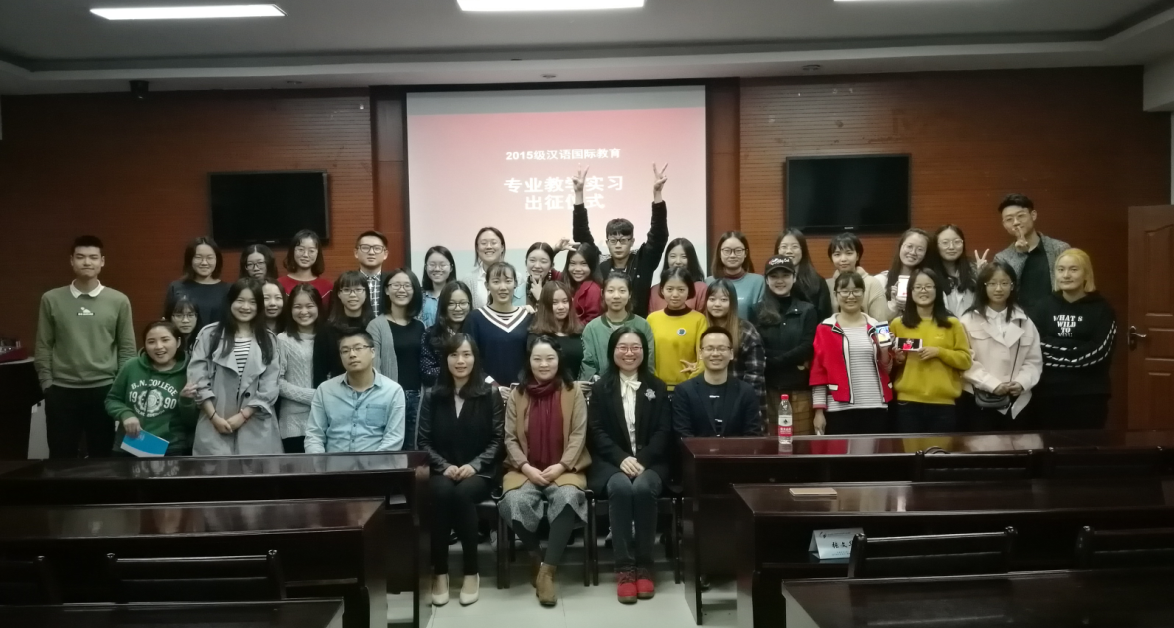【本网讯】10月27日晚,文化艺术学院2015级汉语国际教育专业教学实习出征仪式在龙泉校区一教二楼会议室举行,欢送即将奔赴北京汉友通国际教育公司、成都美和汉语公司、四川大学国际教育学院进行专业教学实习的同学们。学院院长廖思湄,党总支书记陶若铭,班导师刘洁、辅导员黄炼、汉语国际教育教研室主任许有平、副主任王冠,汉语国际教育专业2015级全体同学参加出征仪式。