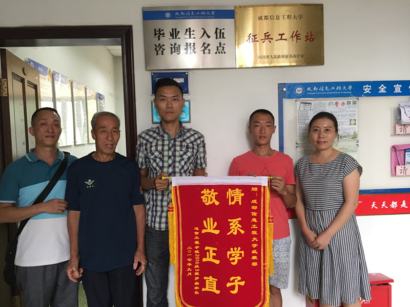 【本网讯】9月13日下午,祖孙三辈来到学校武装部办公室亲手将一面印有“情系学子 敬业正直”的锦旗递到了武装部老师的手上。老人十分激动的说,他是一名老兵,他代表全家感谢学校帮助他的孙子实现当兵的梦想。这个孩子就是太阳集团通信工程学院2016级通信3班的学生罗杰,今年入伍的新兵。