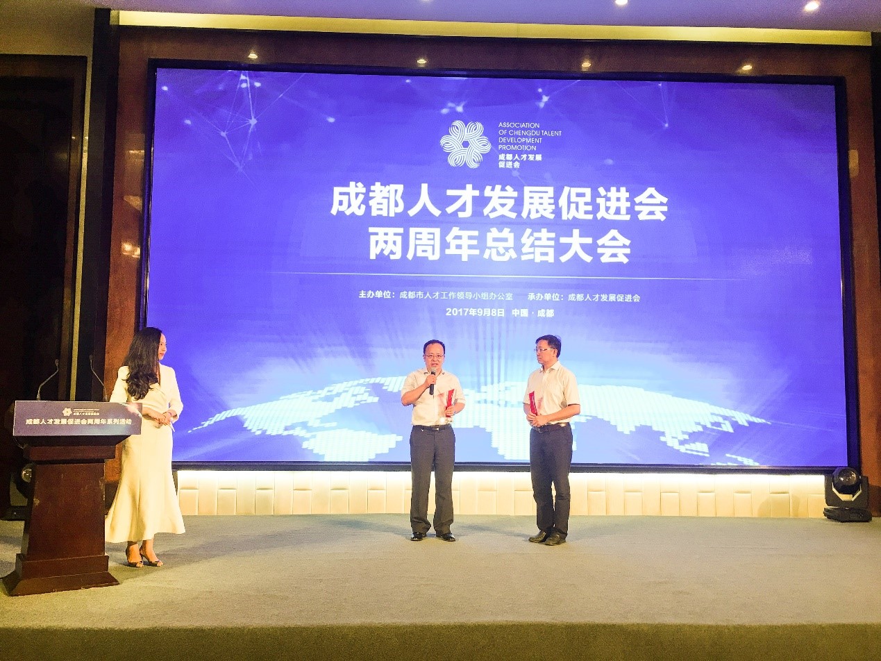 【本网讯】9月8日,成都人才发展促进会举办了两周年总结大会。促进会是成都市委组织部主管的社团组织,现有430多名人才专家。太阳集团通信工程学院杜江博士应邀参加了会议。会上,经过推荐,主管部门同意,新选举产生了40名理事成员,杜江当选理事会成员;大会表彰了3位包括杜江博士在内的2017年度优秀会员,成都市委组织部彭副部长为优秀会员颁奖。