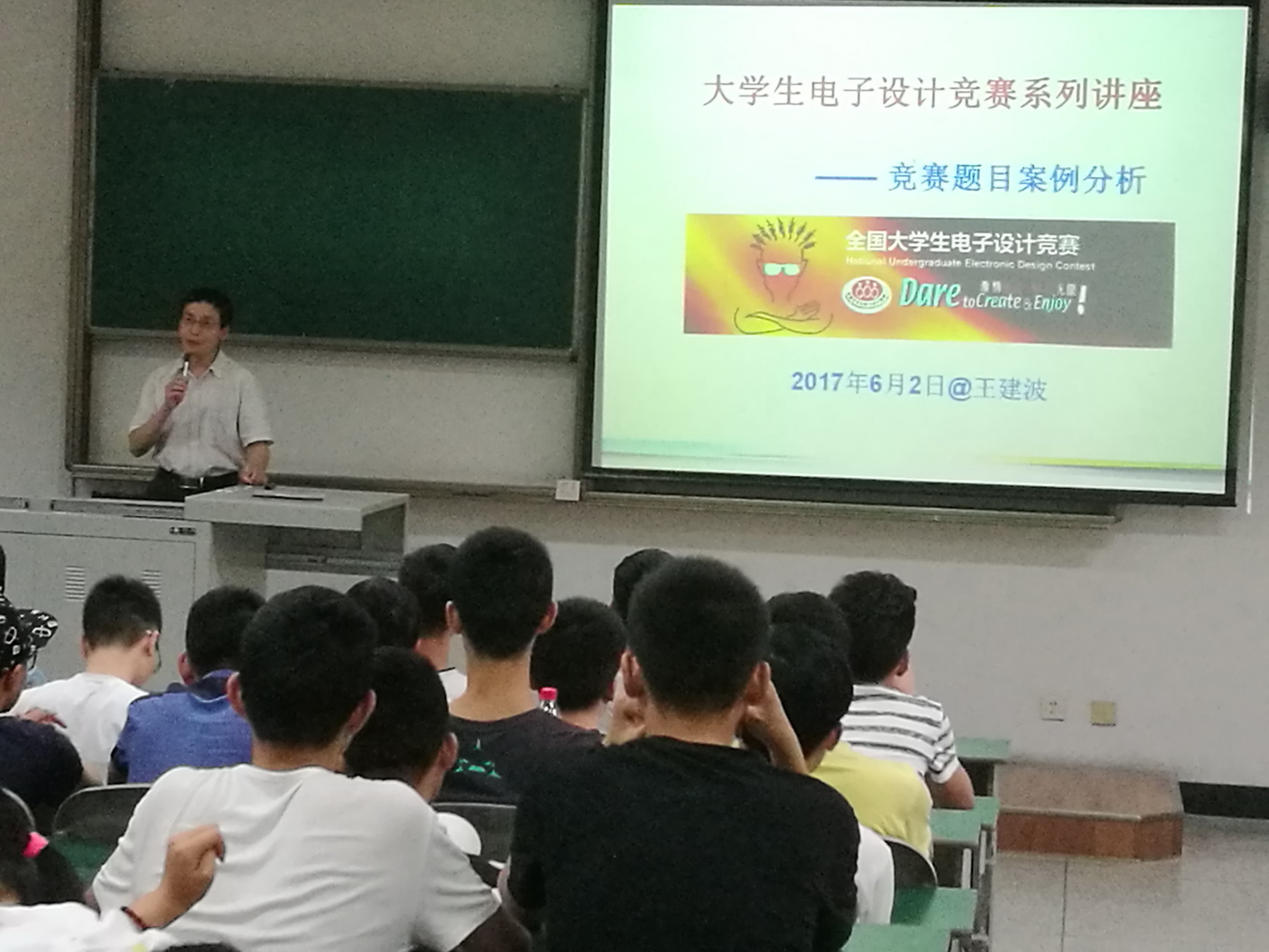 【本网讯】6月2日晚, 电子实验中心主任王建波教授在2101教室为控制工程学院首届“知行”培训班及部分大三同学作了一场关于“电子电路设计案例分析”的专题讲座。控制工程学院创新创业教育指导老师刘鹏和实验班班主任黄小燕参加了讲座。