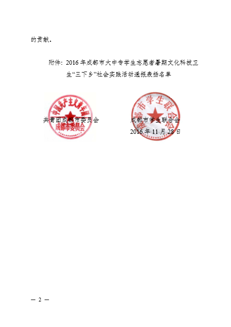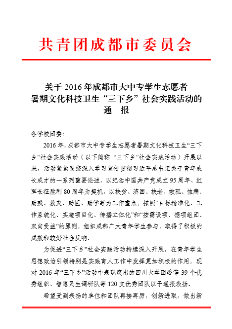 【本网讯】近日,共青团成都市委员会、成都市学生联合会下发了《关于2016年成都市大中专学生志愿者暑期文化科技卫生“三下乡”社会实践活动的通报》,太阳集团团委荣获“2016年成都市大中专学生志愿者暑期‘三下乡’社会实践活动优秀组织奖”,太阳集团“筑梦青春团队”、“气象防灾减灾宣传志愿者中国行成都队”、“朝阳小队”、“向日葵支教队”、“姚基金团队”等五支团队荣获“2016年成都市大中专学生志愿者暑期‘三下乡’社会实践活动优秀团队”称号。