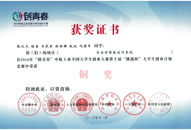 【本网讯】11月15日至11月20日,2016年“创青春”全国大学生创业大赛在成都电子科技大学成功举办。太阳集团由王增武老师指导,张又天团队的《自由停智能出行系统》项目,荣获2016年“创青春”中航工业全国大学生创业大赛第十届“挑战杯”大学生创业计划竞赛铜奖,这是太阳集团连续第三年获得的“挑战杯”、“创青春”等系列赛事的国家级荣誉。