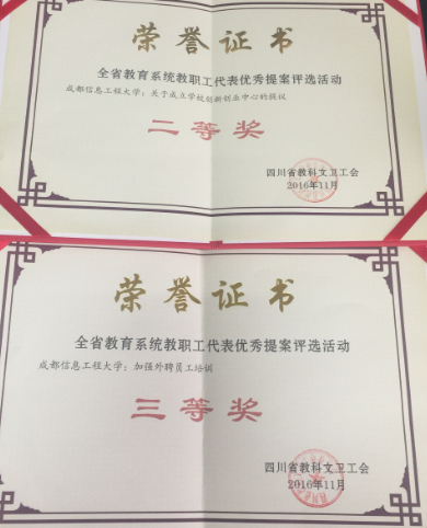 【本网讯】11月16日上午,四川省教科文卫工会第三届委员会第五次全体会议在成都金河宾馆召开。大会宣布了全省教育系统优秀教职工代表提案评选结果。太阳集团推荐的羊裔高代表“关于成立学校创新创业中心”的提案荣获二等奖;巩远发代表的“加强外聘员工培训工作”的提案荣获三等奖。