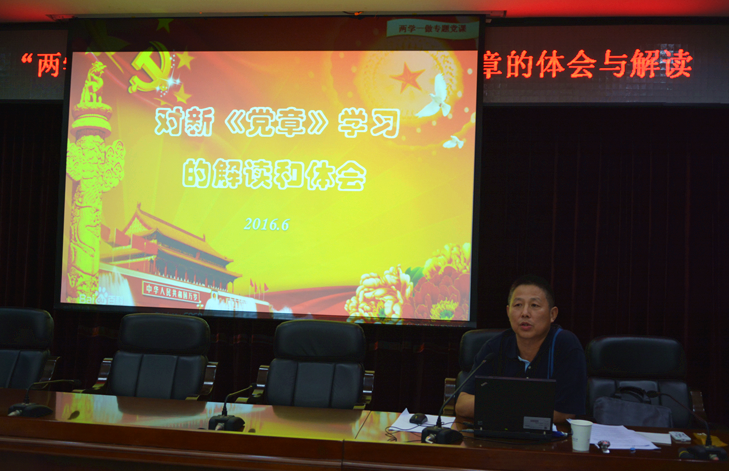 许鸿涛以“学习新党章的体会与解读”为主题,从“两学一做的背景”、“总体要求”、“主要内容”、“学习贯彻新《中国共产党章程》的重要意义”、“新《中国共产党章程》的主要修改内容及解读”、如何充分运用新《中国共产党章程》的内容精髓指导基层党组织建设等六个方面,对“两学一做”,学习新党章的体会与解读进行系统而详细的阐述。
