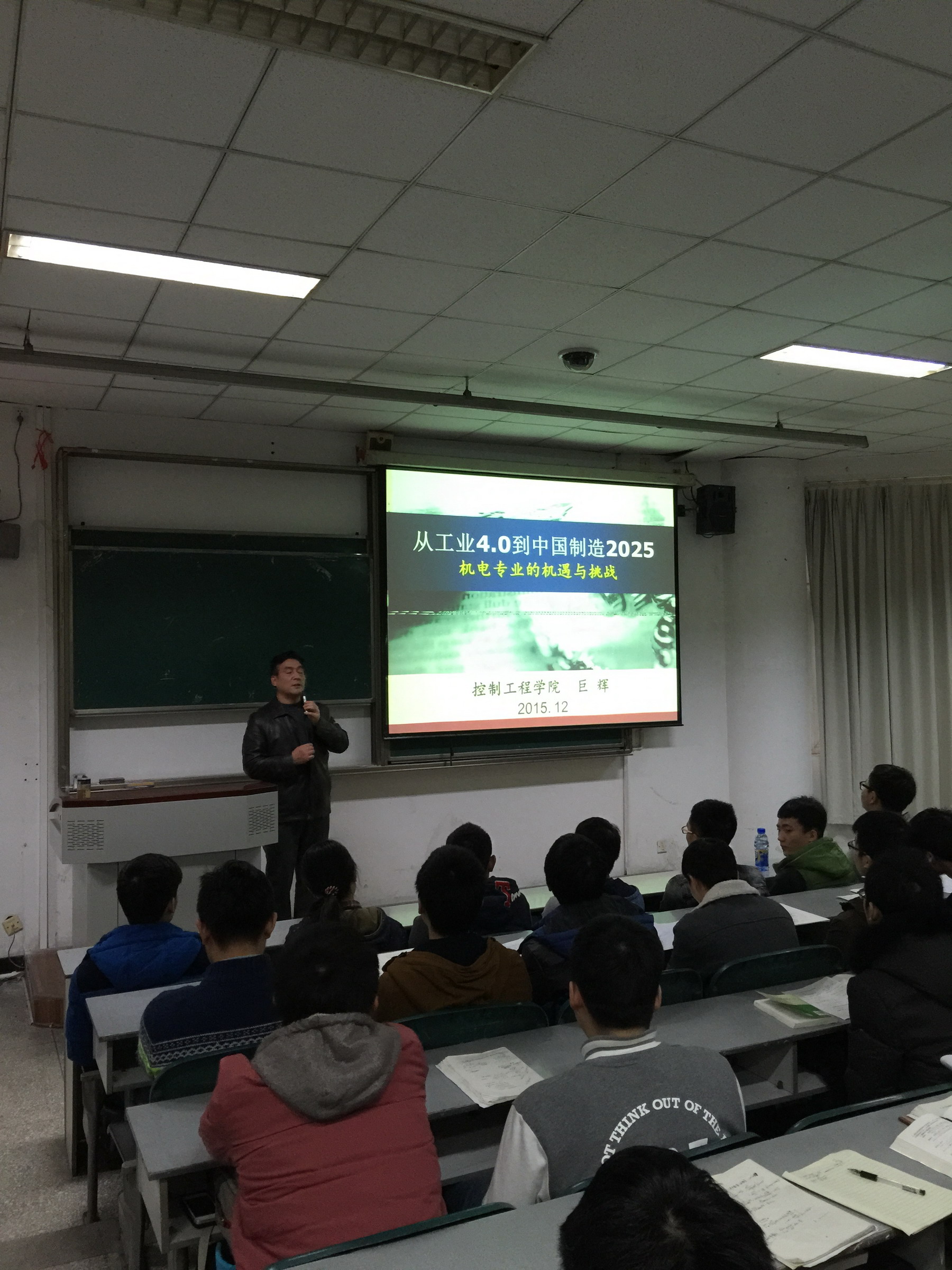 巨辉首先对15级机电专业新生的加入表示了欢迎,鼓励同学们坚持自己的选择,接下来,向同学们介绍了控制工程学院以及机械电子工程专业的创立与发展历程,其中包含了控制工程学院浓郁的学术氛围、良好的学风、独具特色的科研活动等诸多方面。对于机械电子工程专业,巨辉以“从工业4.0到中国制造2025”为题,详细阐述了机电专业目前面临的机遇和挑战,着重分析了机电专业和本学院的电气、自动化、测控等其他专业的区别以及本专业设立的必要性和重要性,同时强调,作为该专业的学生,在了解自己专业的同时,应当发挥专业优势,培养对机械电子产业灵敏的洞察力和创新力,把握机械电子工业快速发展的时代潮流,发挥创意对机械电子产业的积极推动作用,学以致用。讲座的尾声,巨辉鼓励同学们面对朝阳产业、面对广阔市场、面对严峻挑战,努力学习、刻苦钻研、大胆创新,路在脚下,敢于挑起智能制造的重担。