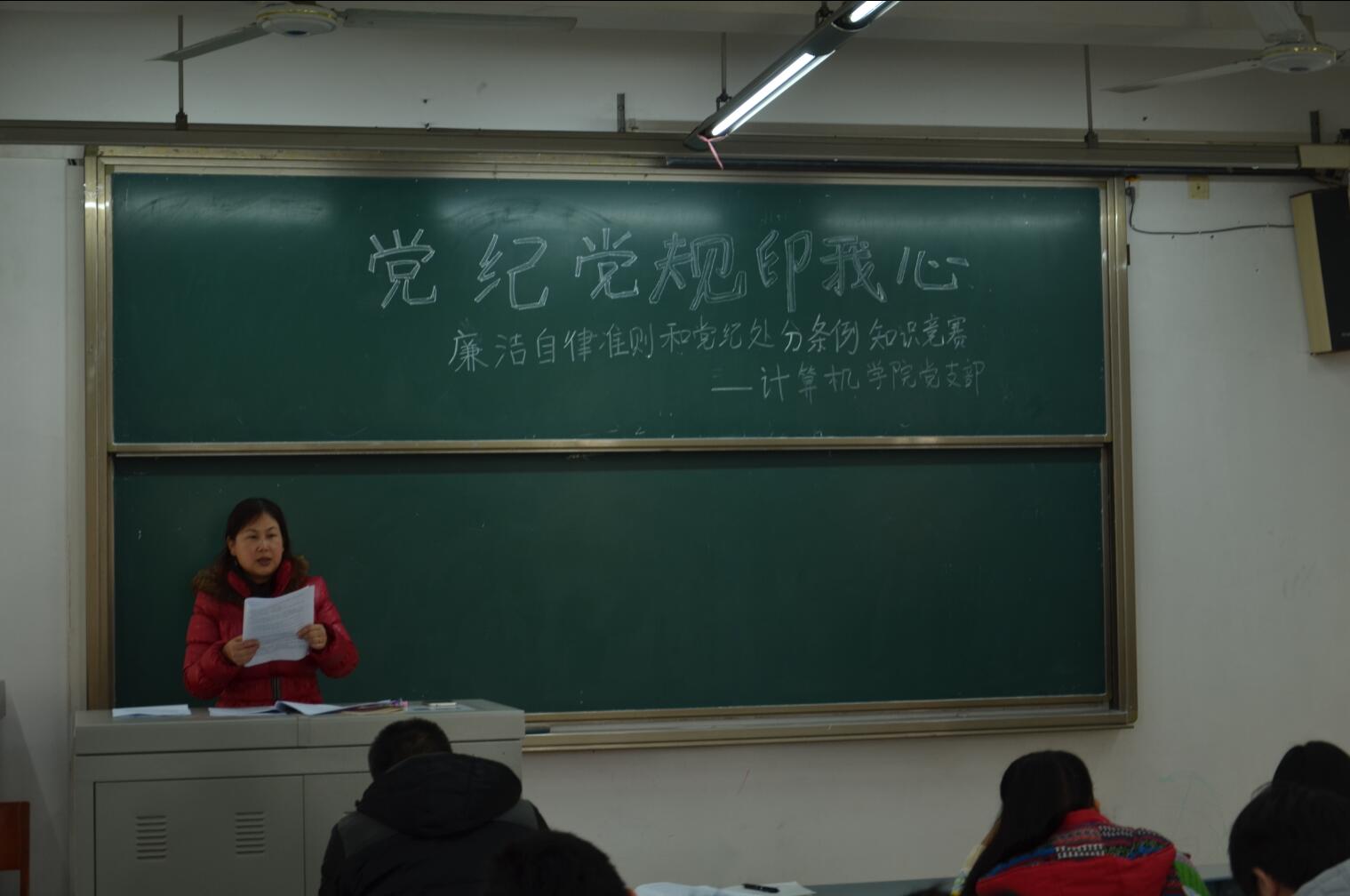 【本网讯】1月4日中午,计算机学院党支部在航空港1104教室开展“党纪党规印我心”廉洁自律准则和党纪处分条例知识竞赛,学院13级至15级部分学生党员参加了本次竞赛。