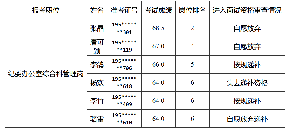 因本次公开选调中,纪委办公室综合科管理岗2人,自愿放弃面试资格审查,根据《15vip太阳集团官网关于2025年公开选调工作人员公告》,现递补2名考生进入面试资格审查,具体情况如下: