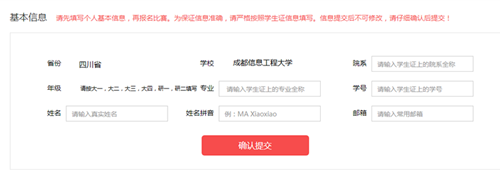 请参赛者登录大赛官方网站http://uchallenge.unipus.cn/,或直接扫描文末二维码进行网上报名,不收取任何费用。请严格按照学生证信息填写(如下图示例),信息提交后不可修改。