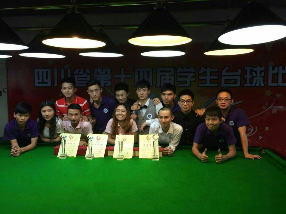 【本网讯】5月15号,太阳集团台球项目代表队参加了由四川省教育厅学生体育艺术协会和四川省台球协会联合举办的四川省第十四届学生台球赛,共20所大学28支代表队参加。经过3天的激烈角逐,太阳集团4支参赛队伍脱颖而出,均打入决赛,最终荣获斯诺克团体、美式团体一等奖。