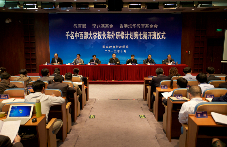 “千名中西部大学校长海外研修计划第七期开班仪式”于10月18日在国家教育行政学院举办,开班仪式由国家教育行政学院副院长牛文起主持。教育部港澳台办公室常务副主任赵灵山和国家教育行政学院党委书记、常务副院长马俊杰出席并讲话,教育部办公厅副巡视员孙海波代表参团学员讲话。