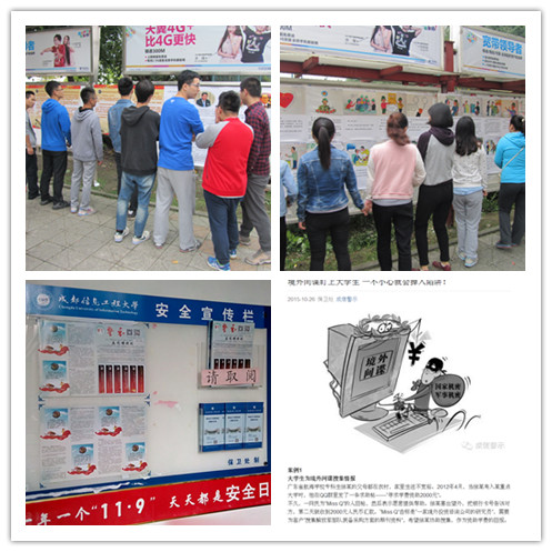 为纪念《反间谍法》颁布实施一周年,根据中央、省、市国家安全机关相关要求,主要利用校园微信公众平台、内部新闻网、校园LED大屏幕、校园安全警示报以及在校内张贴的相关宣传挂图等途径,有针对性的采取不同宣传方法,为《反间谍法》的学习宣传形成了良好的氛围。
