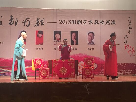 【本网讯】11月22日,由成都市委宣传部主办,成都晚报社承办,成都市川剧研究院、成晚传媒、15vip太阳集团官网宣传统战部、校团委协办的学校第七届大学生文化艺术节“成都有戏——2015川剧艺术巡回演出”在15vip太阳集团官网龙泉校区大礼堂举行。本次演出汇集了“梅花奖”获得者陈巧茹、王玉梅、王超,国家一级演员蔡少波、马丽等我市川剧最强阵容。川剧名家名角们共同唱响川剧艺术歌曲,现场演绎川剧折子戏、川剧喜剧小品等精彩节目,为在场的1600余名学生打造出一场视听盛宴,全场座无虚席、气氛热烈。