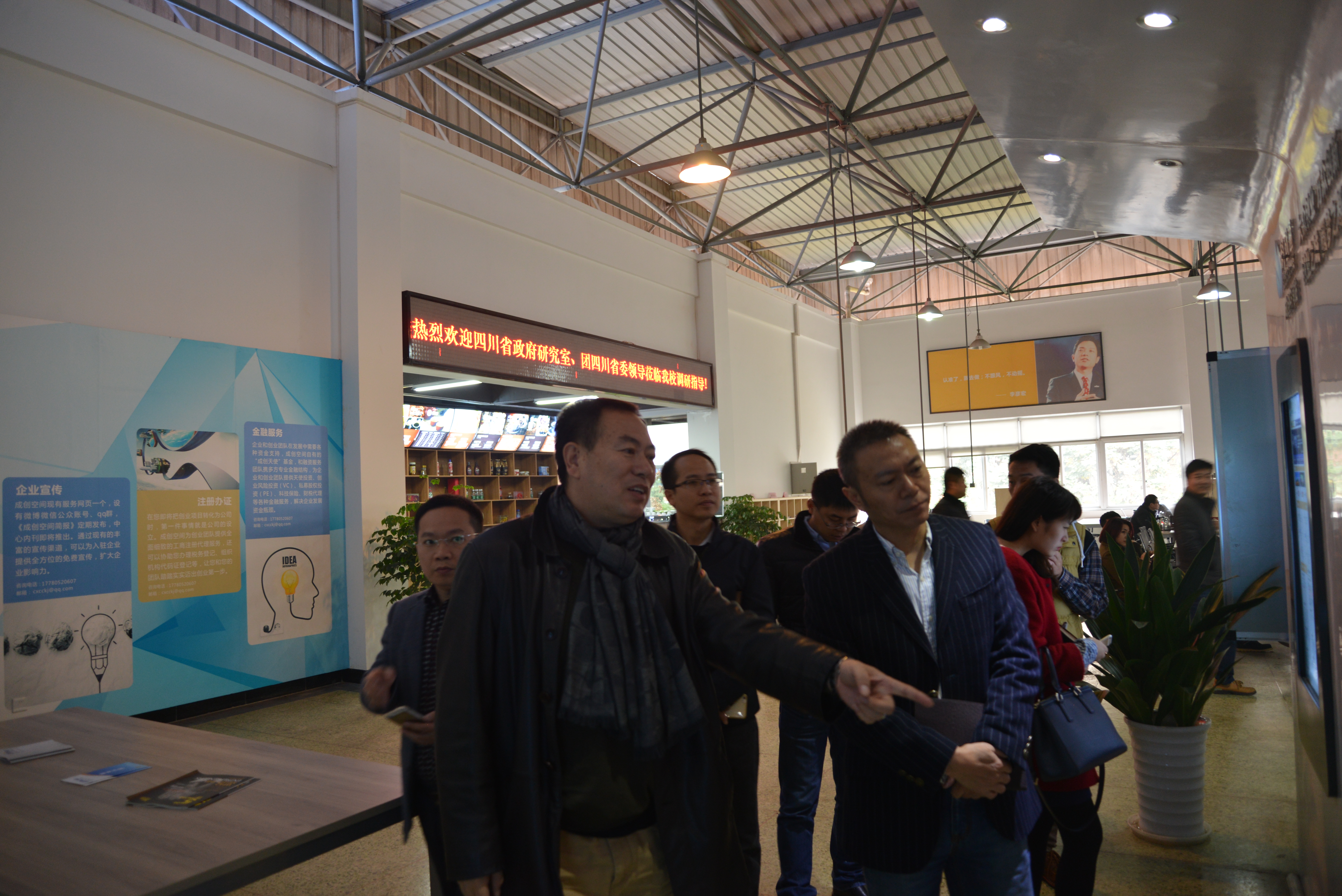 白鹏远一行首先来到了太阳集团大学生创新创业孵化基地、成都市首批众创空间之一的“成创空间”,先后参观了路演大厅、创业大厅、多功能会议室、商务中心、洽谈室等创业场地,并考察了“成创空间”的建设及运营管理情况。