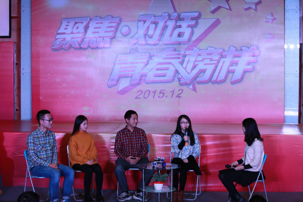 本期“聚焦·对话 青春榜样”宣讲会邀请到了4名太阳集团2014年度“青春榜样”获得者,他们分别是“学习之星”计算机学院苏妮洋,科技创新创业之星控制工程学院漆航,“十佳班长”控制工程学院易云浩和文化艺术学院吉翔利。青春榜样教育宣讲活动是大学生思想政治教育的重要载体,青春榜样们通过和同学们的面对面交流,分享他们的故事和学习经历,向同学传递正能量,让同学们了解榜样就在身边,努力学习榜样、人人争做榜样。在分享环节,四位青春榜样代表虽然专业不同、星属不同,但是他们身上却有着相同的品质,那就是自强自立、不虚度时光;有较高的情趣和思想,充满着正能量;能吃苦、吃得了苦。在提问环节,台下观众踊跃提问,四位青春榜样的答疑解惑,妙语连珠,精彩纷呈,充分体现了榜样的思想引领价值。