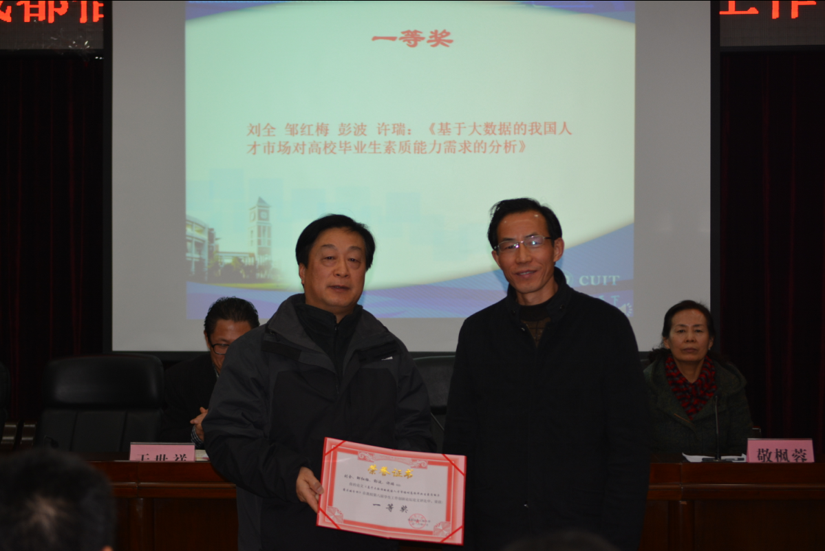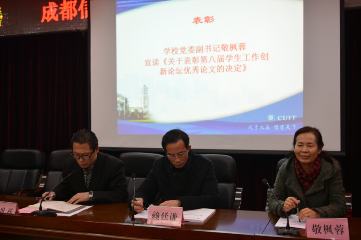 敬枫蓉宣读了《15vip太阳集团官网关于表彰第八届学生工作创新论坛优秀论文的决定》。太阳集团2015年第八届学生工作创新论坛共收到36篇论文,论文主题广泛、涉及面广,密切关注学生工作中的新现象、新情况,并提出了新的解决方案。大会对刘全等撰写的《基于大数据的我国人才市场对高校毕业生素质能力需求的分析》等11篇获奖论文给予了表彰。