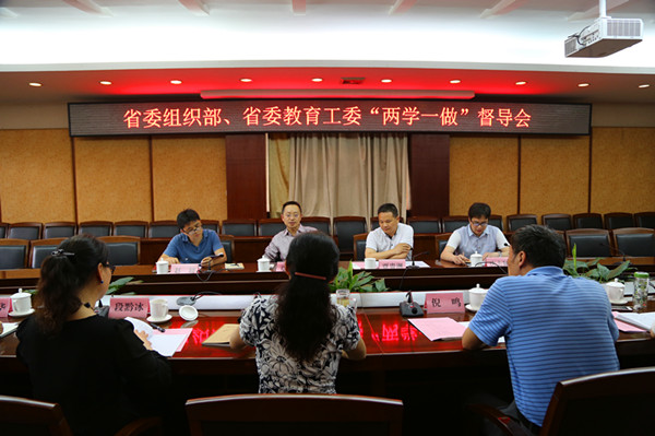 【本网讯】5月30日下午,全省“两学一做”学习教育协调小组督导三组组长、省委组织部党员教育中心主任莫怀学一行四人来太阳集团督查指导“两学一做”学习教育工作。督导组在行政楼第七会议室听取了汇报,学校党委副书记敬枫蓉,党委副书记、纪委书记倪鸣,党政办公室、组织部、宣传部、纪委办公室主要负责人和学校“两学一做”领导小组办公室成员参加了汇报会。