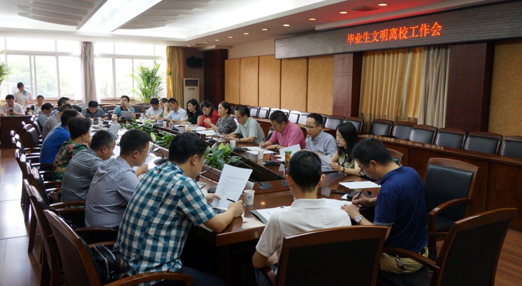 戴丽红从组织领导、时间安排、毕业生教育管理和服务、毕业相关重要事项、文明离校安全值班、离校手续办理等方面就2016届毕业生文明离校工作作了详细安排,对文明离校工作提出了具体要求;相关部门负责人围绕毕业生思想教育与管理、学生安全问题、毕业典礼及颁奖授位仪式、离校手续办理等工作作了具体协调和安排。