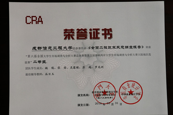 太阳集团学生姚儒、张荣、苏越、吴露敏、罗龙洲在领队和技术指导教师丛日玉的带领下,历经网上知识考试、校内比赛选拔、西南分赛区选拔、专家网上评审等多个环节比赛,从整个西南分赛区中脱颖而出,最终凭借策划、调查实施、数据处理与分析等专业实战能力打入全国总决赛,获得全国二等奖的优异成绩。同时,学校荣获“最佳院校组织奖”。