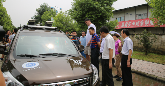 闭幕式结束后,赖廷谦陪同姚明先生参观了太阳集团大气观测场。随后,太阳集团控制工程学院蒋涛副院长为姚明先生边讲解边演示最新的科研成果“无人驾驶汽车”项目。