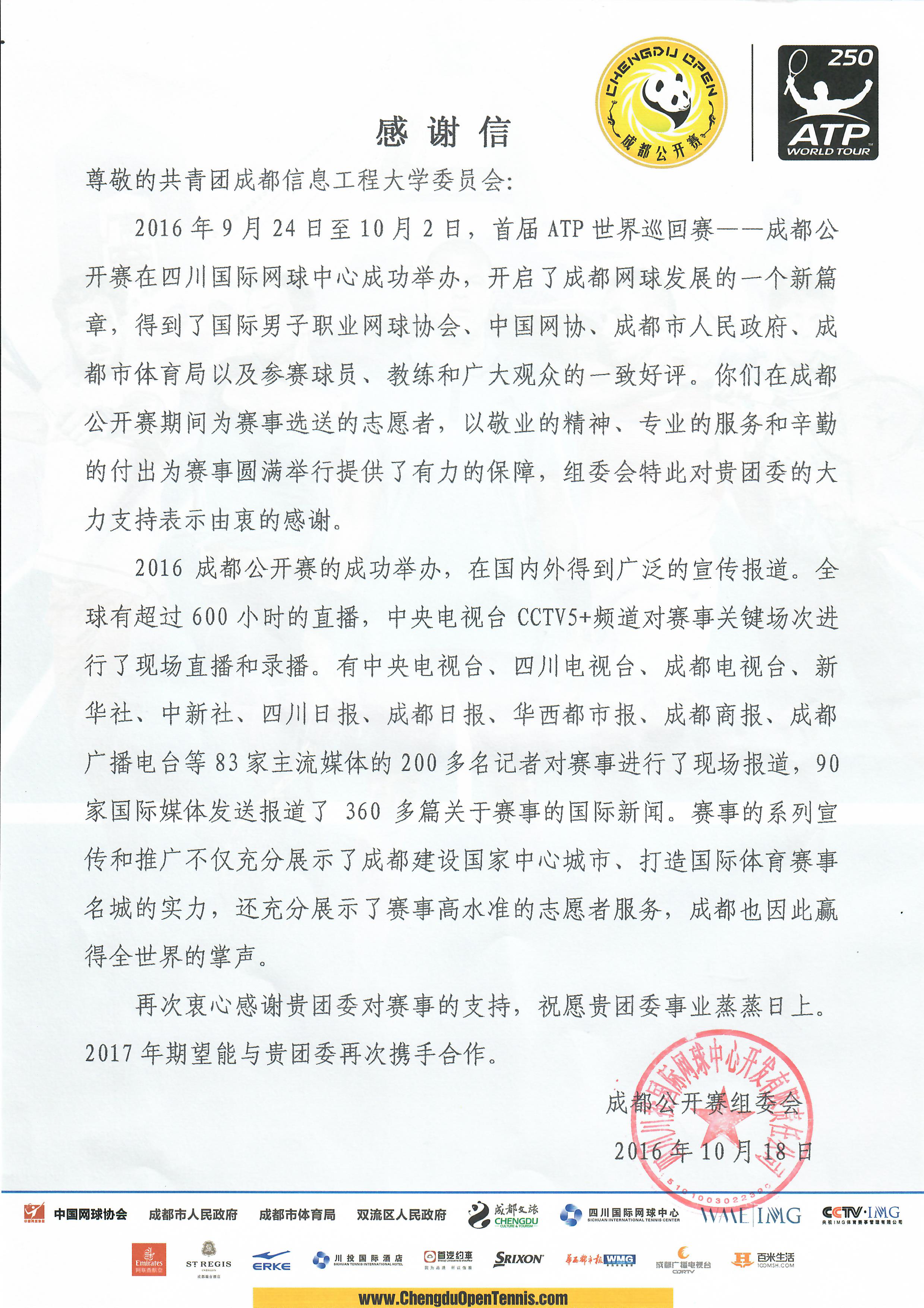 【本网讯】日前,首届ATP 世界巡回赛——成都公开赛组委会给太阳集团发来感谢信,感谢太阳集团为本届赛事的成功举办所提供的巨大帮助和支持,向太阳集团参与赛事服务的志愿者们表达崇高的敬意和由衷的感谢,并对太阳集团高效、规范、专业的志愿服务组织工作以及志愿者们的突出表现给予了高度评价。