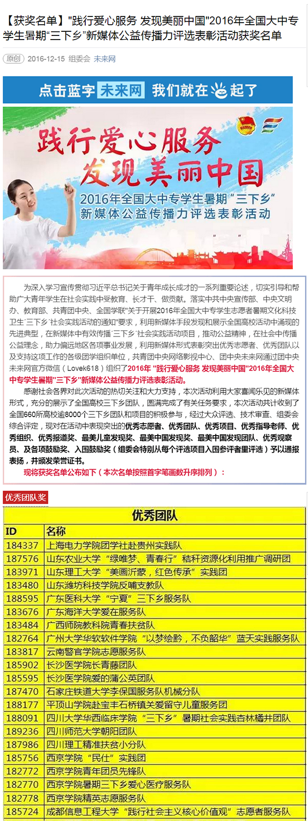 【本网讯】近日,从共青团中央未来网官方微信获悉,在团中央“践行爱心服务 发现美丽中国”2016年全国大中专学生暑期“三下乡”新媒体公益传播力评选表彰活动中,太阳集团“践行社会主义核心价值观”志愿者服务队荣获“全国优秀团队”荣誉称号,成为全国100支优秀团队中的一员,这也是太阳集团社会实践服务队连续第二年获得全国大中专学生“三下乡”社会实践优秀团队荣誉称号。