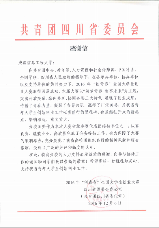 【本网讯】日前,共青团四川省委给太阳集团发来感谢信,感谢太阳集团为2016年“创青春”全国大学生创业大赛的成功举办所提供的巨大帮助和支持,并对太阳集团在省级参赛代表团接待工作中的突出表现给予了高度评价。