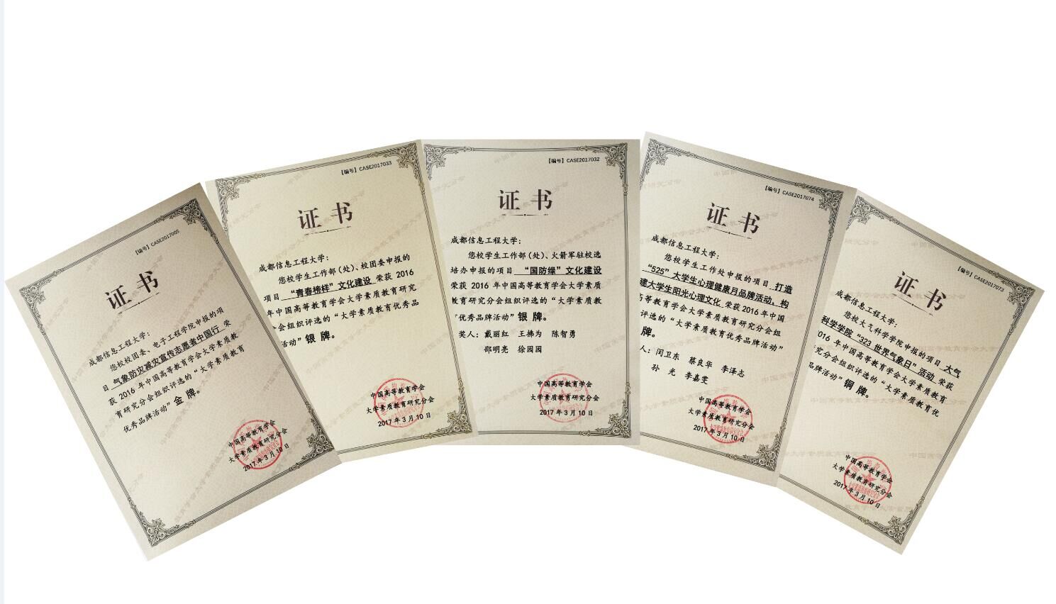 论坛开幕式上公布了2016年大学素质教育优秀品牌活动评选结果并进行了颁奖。全国共有135个项目分别获得金、银、铜牌,太阳集团团委、电子工程学院申报的“气象防灾减宣传志愿者中国行”荣获金牌;学生工作处、校团委申报的“青春榜样文化建设”和学生工作处、火箭军驻校选培办申报的“国防绿文化建设”荣获银牌;学生工作处申报的“打造5.25大学生心理健康月品牌活动,构建大学生阳光心理文化”和大气科学学院申报的“大气科学学院3.23世界气象日活动”荣获铜牌。
