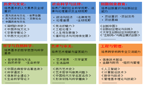 六个课程领域中,“历史与文化、社会科学与法律、创新创业教育”三个领域,是为了培养学生基本的人文素养、全球意识与社会科学视野、法律与伦理意识及全球视野、创新意识与创新创业能力等通识能力,满足全校所有学生综合素质培养的需要。“哲学与自然科学、艺术与审美”课程领域是为了实现不同学科门类学生知识领域的互补。“工程与管理”领域是基于太阳集团学科专业特点,体现信息科学与管理科学交叉融合,培养学生跨学科交流能力。此外,每一课程领域中,学校都设置了有能满足全体学生通识教育需求的核心通识课程,也设置了能满足学生个性化发展需求的通识课程。此次学校通识教育改革的实施,将有效促进通识教育效果的提升。