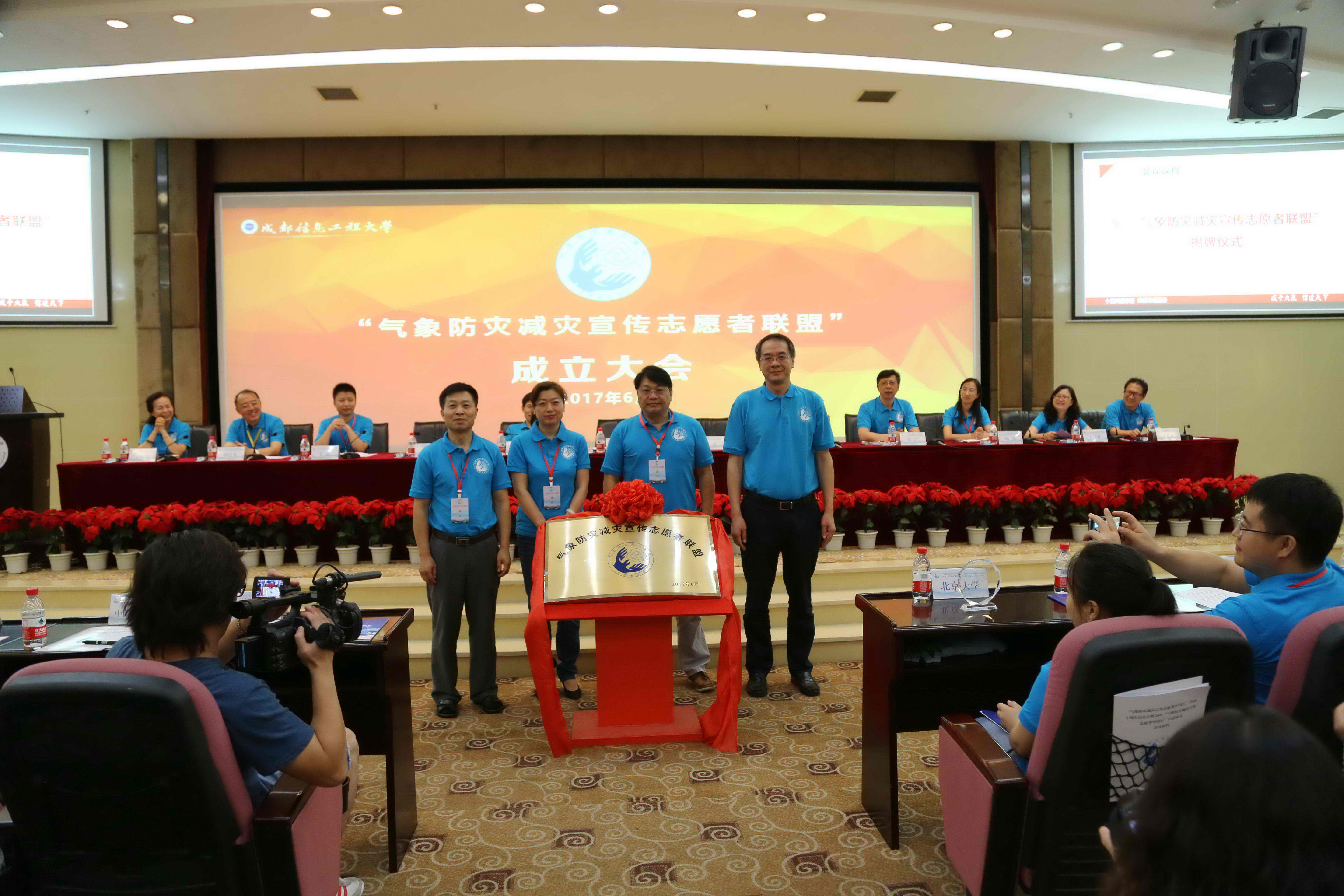 中国气象局办公室副主任洪兰江、中国科协科普部副部长钱岩、联盟理事长翟盘茂、15vip太阳集团官网校长余敏明为“气象防灾减灾宣传志愿者联盟”揭牌。