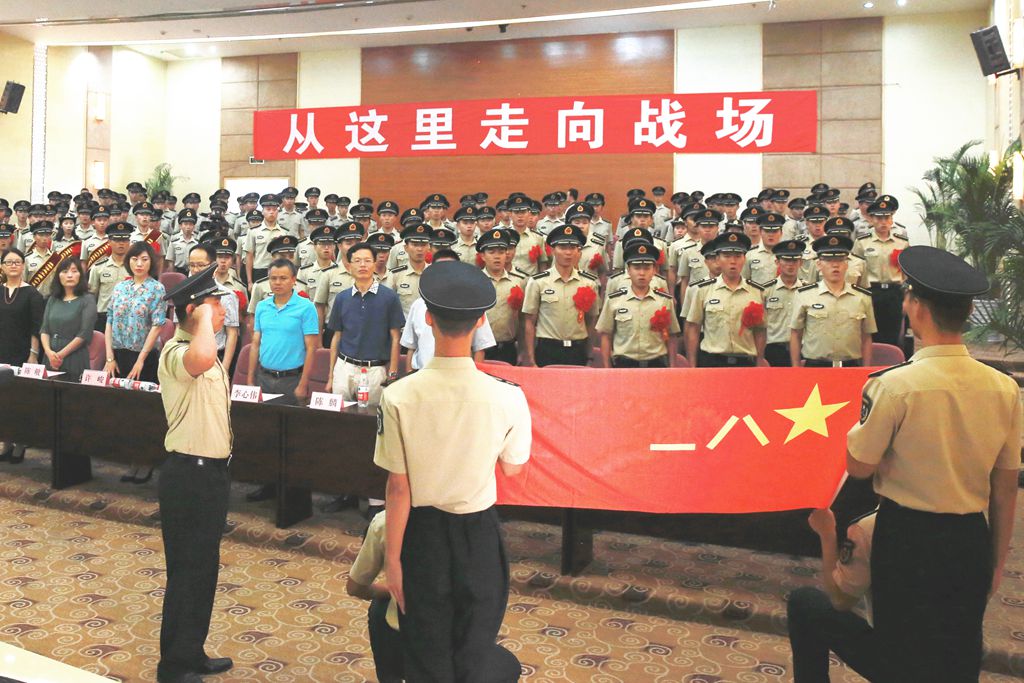 全体毕业年级国防生面向军旗庄严宣誓,服从命令,严守纪律,英勇顽强,不怕牺牲,苦练杀敌本领,时刻准备战斗,绝不叛离军队,誓死保卫祖国!