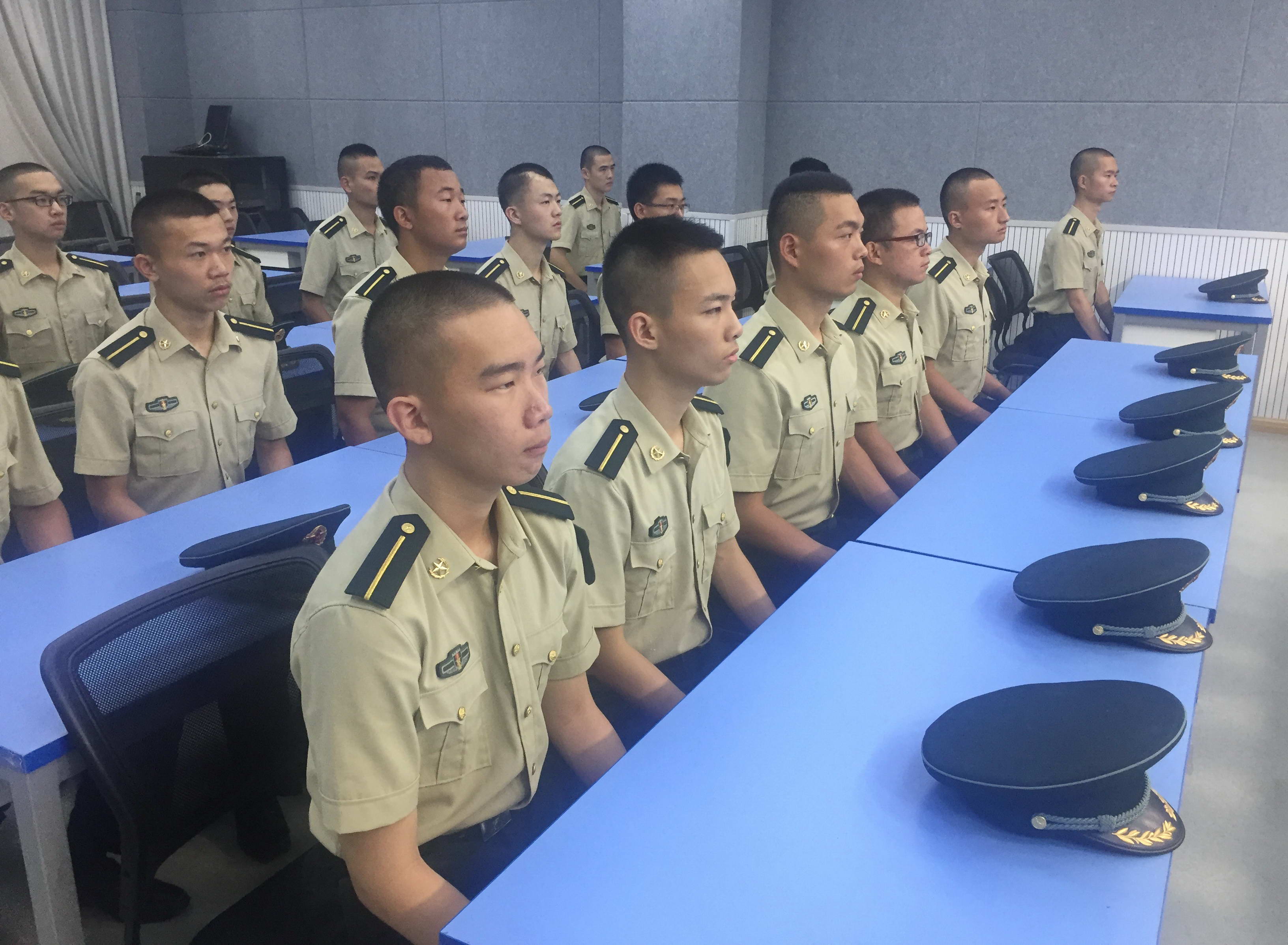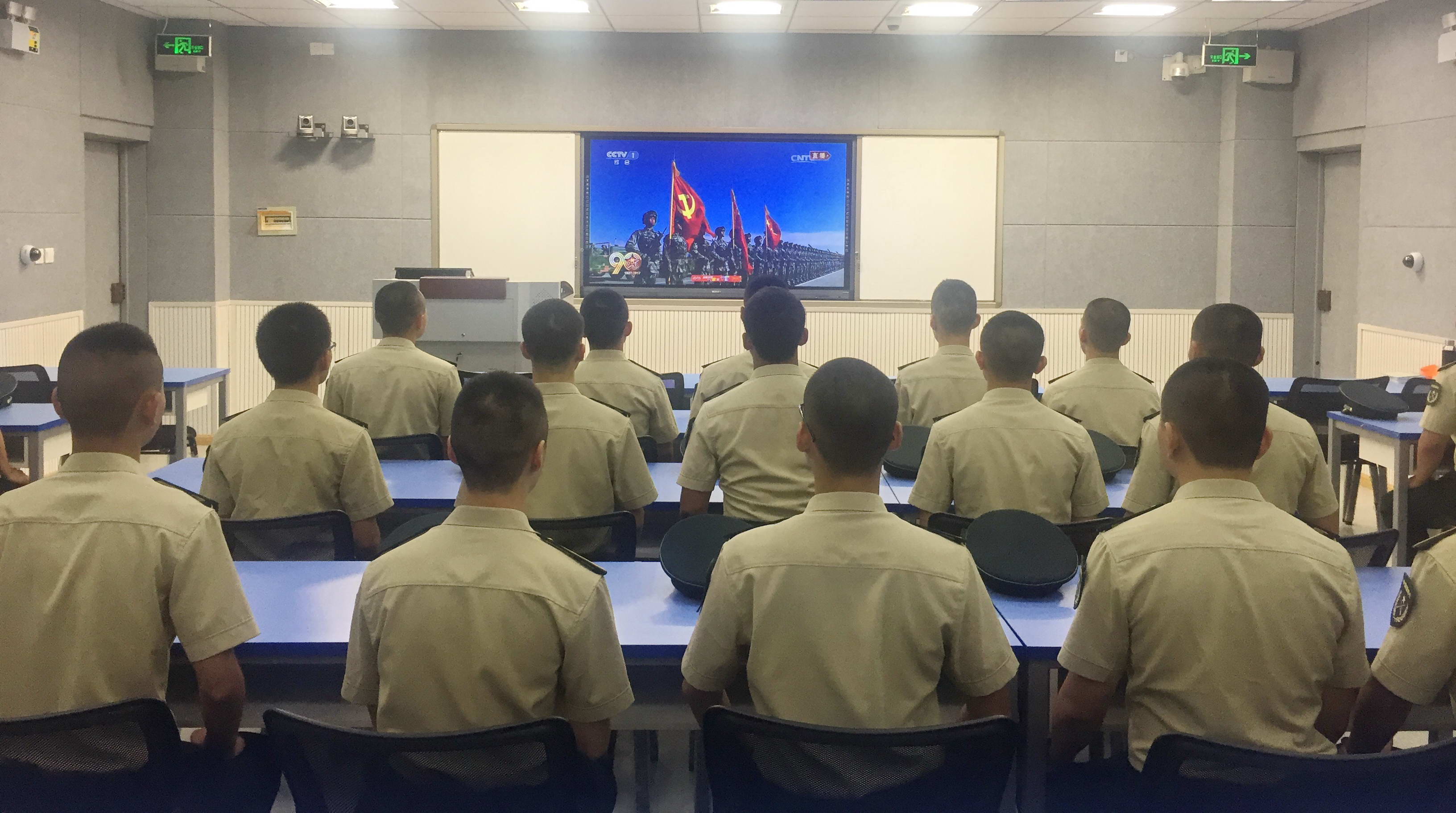 收看中,全体国防生军容严整,精神振奋。当看到屏幕上展示出的各种武器装备时,个个瞪大了眼睛,备受鼓舞。当习近平讲到“我坚信,我们的英雄军队有信心、有能力打败一切来犯之敌!我们的英雄军队有信心、有能力维护国家主权、安全、发展利益!我们的英雄军队有信心、有能力谱写强军事业新篇章”时,全场爆发出热烈的掌声。