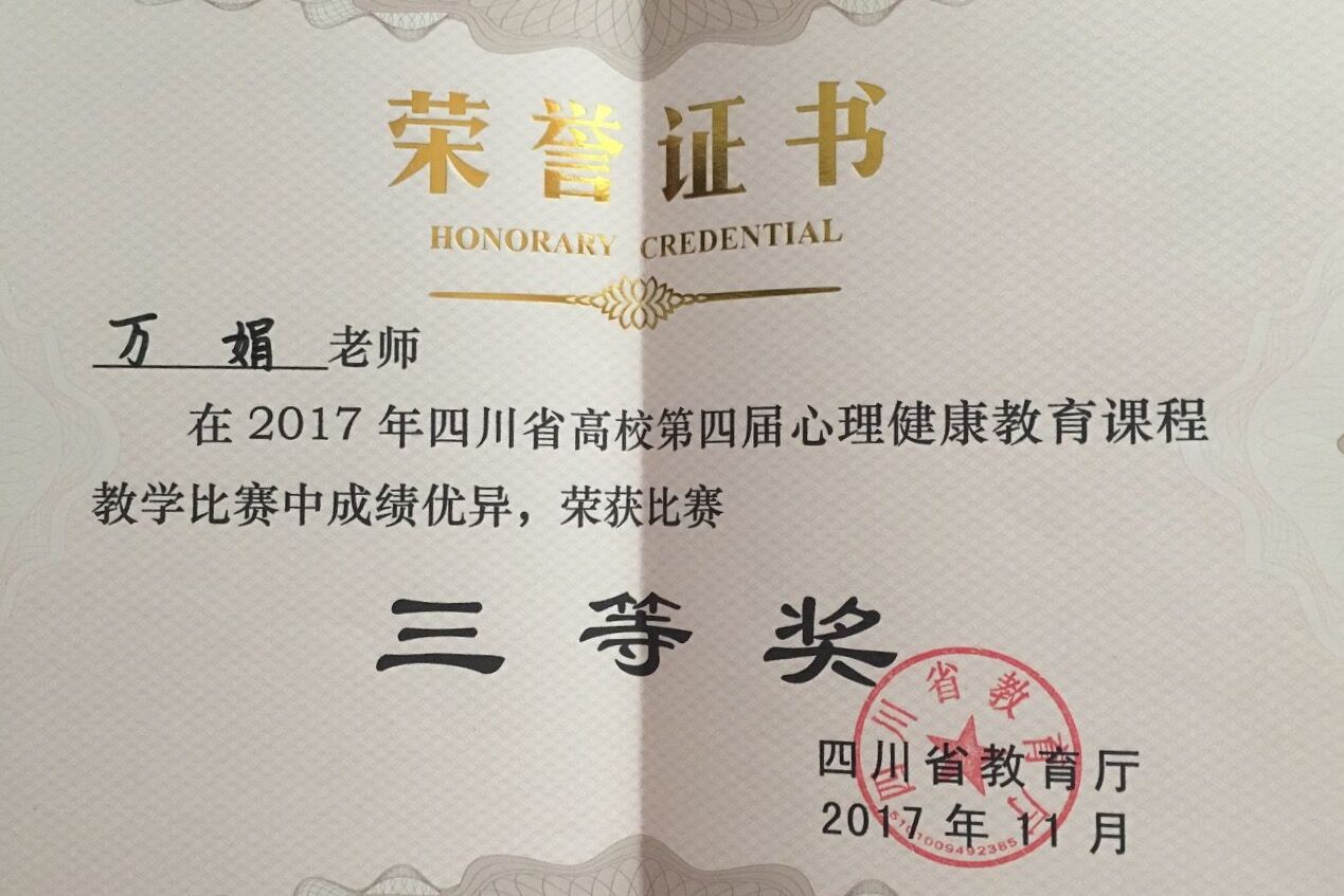 【本网讯】11月17日,第四届四川省高校心理健康教育课程教学比赛在四川旅游学院举行。太阳集团软件工程学院辅导员万娟老师荣获比赛三等奖。