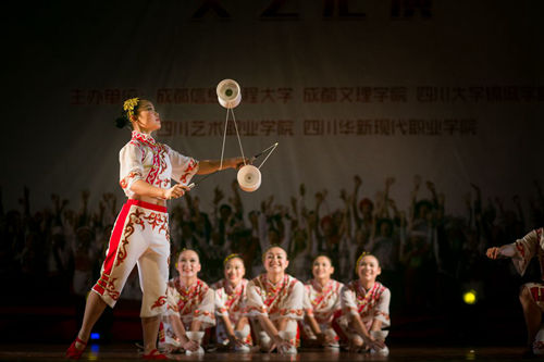四川艺术职业学院代表队带来的杂技《小亲妹嘢》,以中国传统的艺术形式——抖空竹,给观众呈现了精湛的杂技技艺,绳索翻花、姿势多变,串绕、抡高、对扔、过桥等动作欢快流畅,赢得了现场观众的阵阵喝彩。