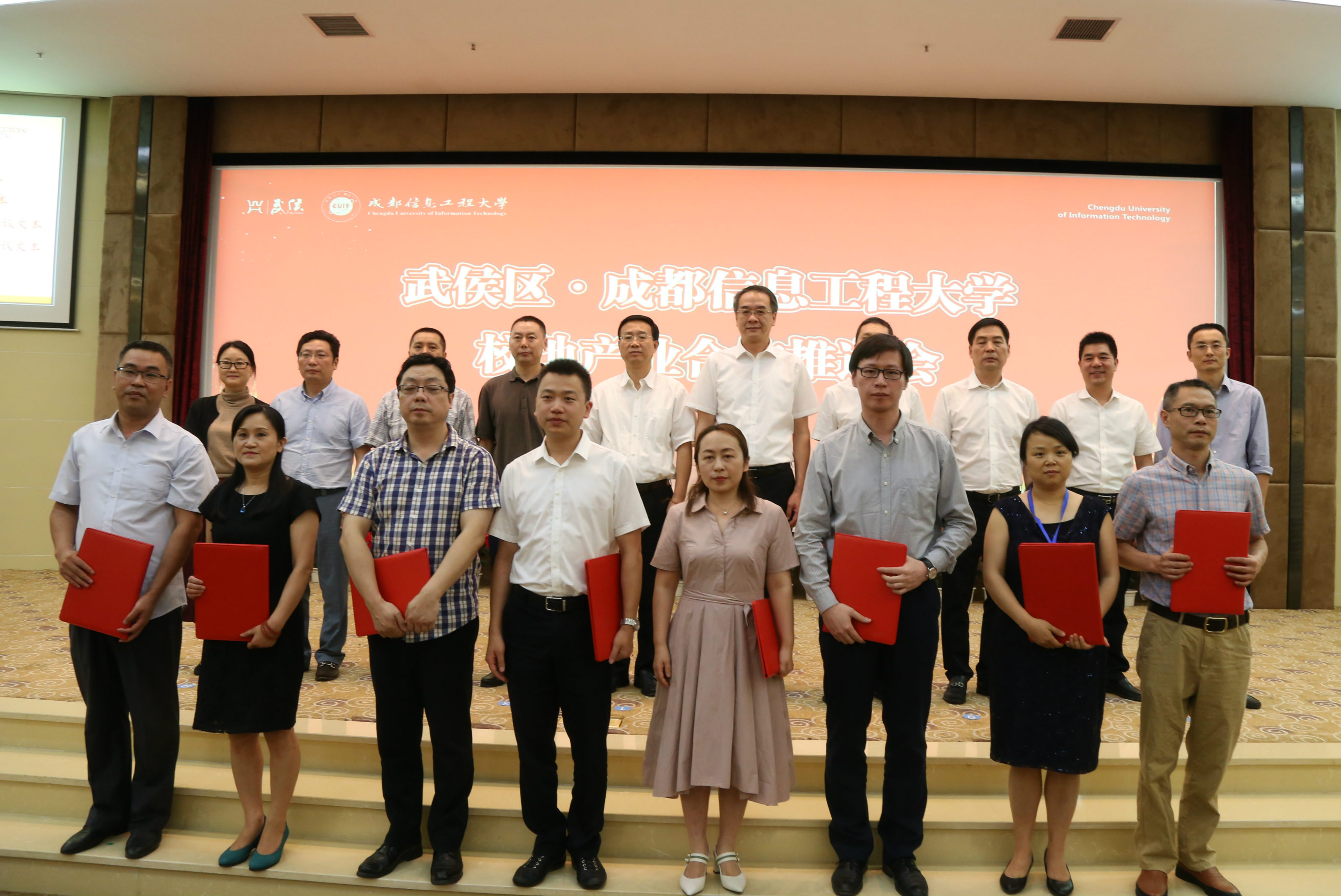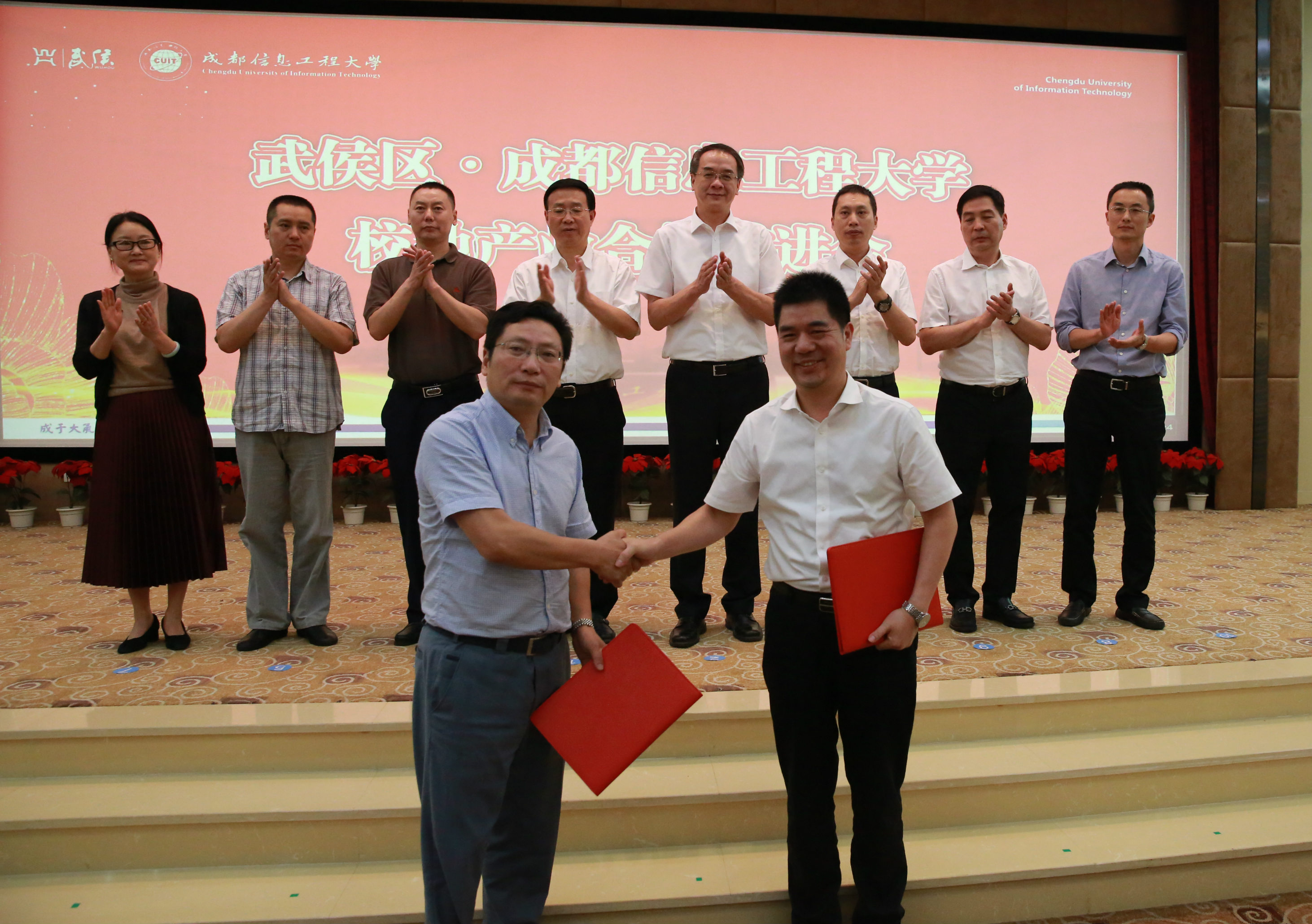 武侯区委统战部、武侯新城管委会、成都京东、四川广宏科技等部门和企业分别与学校宣传统战部、物流学院、电子工程学院在推进会现场交换了合作协议文本。