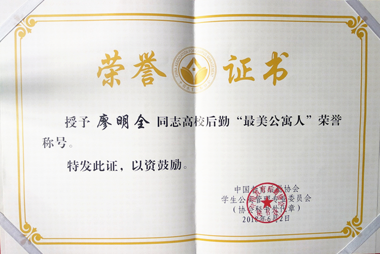 廖明全同志多年来以校为家,凭着一腔热情、一片真心,积极进取、刻苦钻研、务实工作,确保了中心1060余间学生寝室的各项日常报修及时维修到位。正是他这种爱岗敬业的精神,无私奉献的态度,多能高效的技能赢得了大家的交口称赞,得到了领导的信任和同事、师生的认可,在平凡的工作岗位上做出了不平凡的业绩,学生们都亲切的称他“廖叔叔”。
