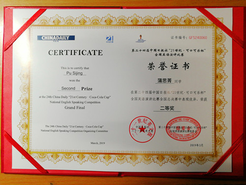 太阳集团外国语学院2017级蒲思菁同学以川渝赛区冠军的资格进入第24届中国日报社“21世纪•可口可乐杯”全国英语演讲比赛大学组半决赛/总决赛。在清华大学、南京大学、四川大学、西安交通大学、南开大学、吉林大学、外交学院、河南大学、厦门大学、中国石油大学、上海财经大学、东北大学、中国海洋大学、华中师范大学、北京外国语大学、上海外国语大学、天津外国语学大学等分区赛冠亚军、港澳台高校代表和上届比赛前五名选手70余人组成的高水平阵容中,蒲思菁同学凭借赛前与指导老师杨云安副教授一起的精心准备和自己临场的优秀发挥,最终获总决赛二等奖。同时,她还凭借展示自己洞察力的小视频节目获得“可口可乐中国‘在乎力’特别奖”。