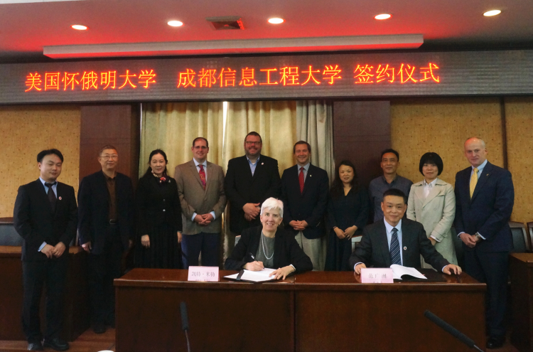 【本网讯】5月9日,学校与美国怀俄明大学( University of Wyoming) 合作签约仪式在航空港校区行政楼七会议室举行。美国怀俄明大学学术事务副校长凯特·米勒、招生管理处副教务长凯尔·摩尔、国际事务副教务长安东尼·奥格登,学校副校长范广洲、电子工程学院、管理学院、继续教育学院院长等参加了签约仪式。