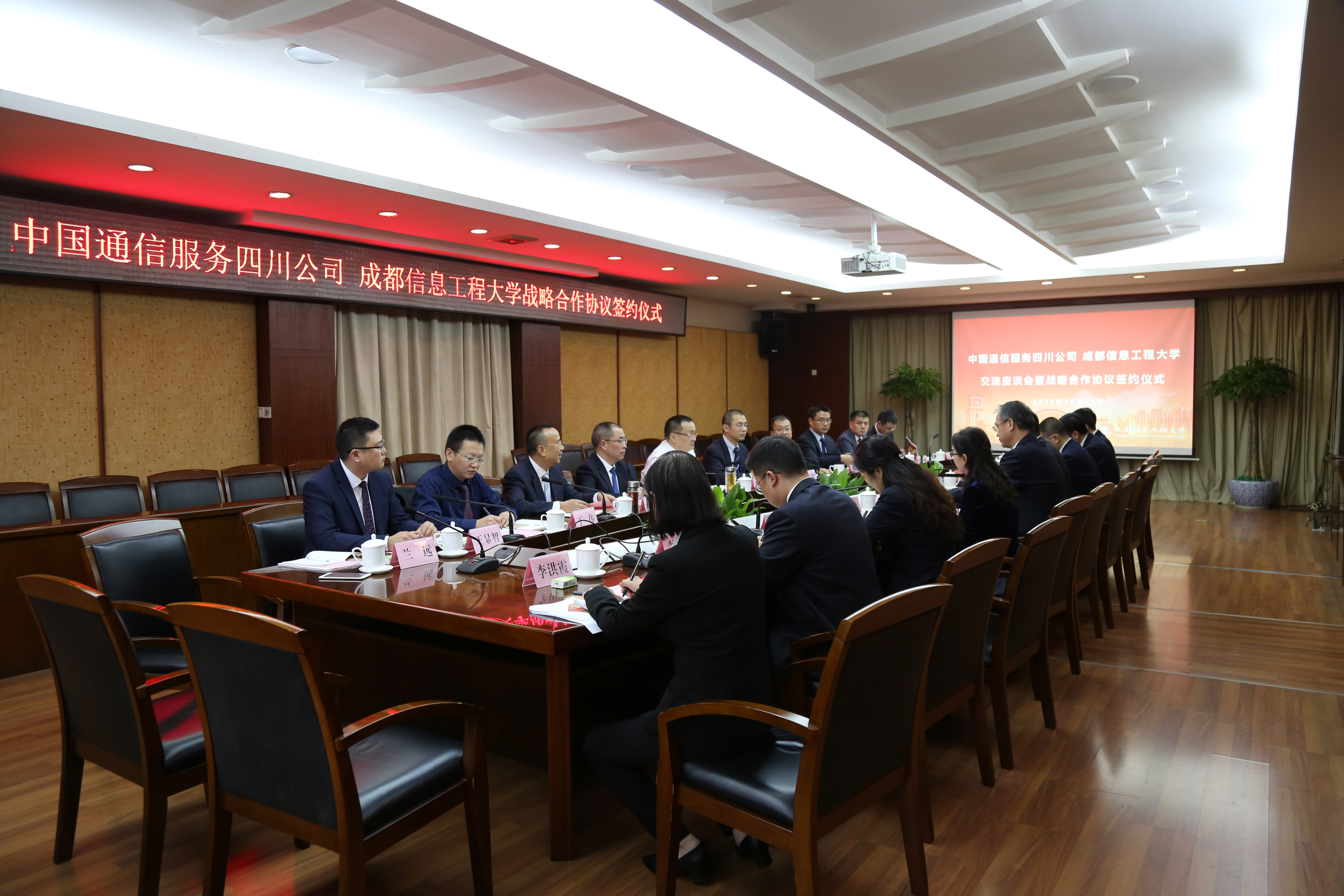 【本网讯】10月21日下午,学校与中国通信服务四川公司交流座谈会暨战略合作协议签约仪式在航空港校区第七会议室举行。中国通信服务四川公司副总经理符美辉、张谨,综合部主任王成松、集客部经理张岱雕、以及成都分公司总经理杨文盛、副总经理徐健一行11人,学校校长余敏明,副校长范广洲,党委办公室、校长办公室、审计处、计划财务处、后勤基建处、资产管理处和信息中心相关负责人等参加了座谈暨签约仪式。座谈会由范广洲主持。