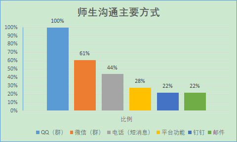 线上教学效果学生满意度较高。根据各学院师生反馈、听课以及调研情况,18个学院均表示大多数学生觉得线上教学方式新颖,教师投入度较高,学生互动及接收程度较好,对线上教学效果反映良好。为保证停课不停学,各学院教学和学工积极联动,通过多种渠道提前与学生建立联系,争取让每一位学生不掉队。各单位与学生联系方式多采取QQ(群)、微信(群)、电话(短消息)等方式。